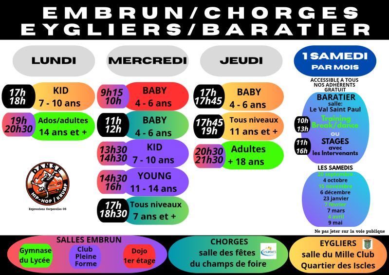 Notre association hip hop est née de la passion pour la danse et l'envie de la partager au plus grand nombre. Située à Embrun, au cœur des Hautes-Alpes, elle propose des activités autour de la danse urbaine: un univers riche qui mélange énergie, créativité et expression personnelle.